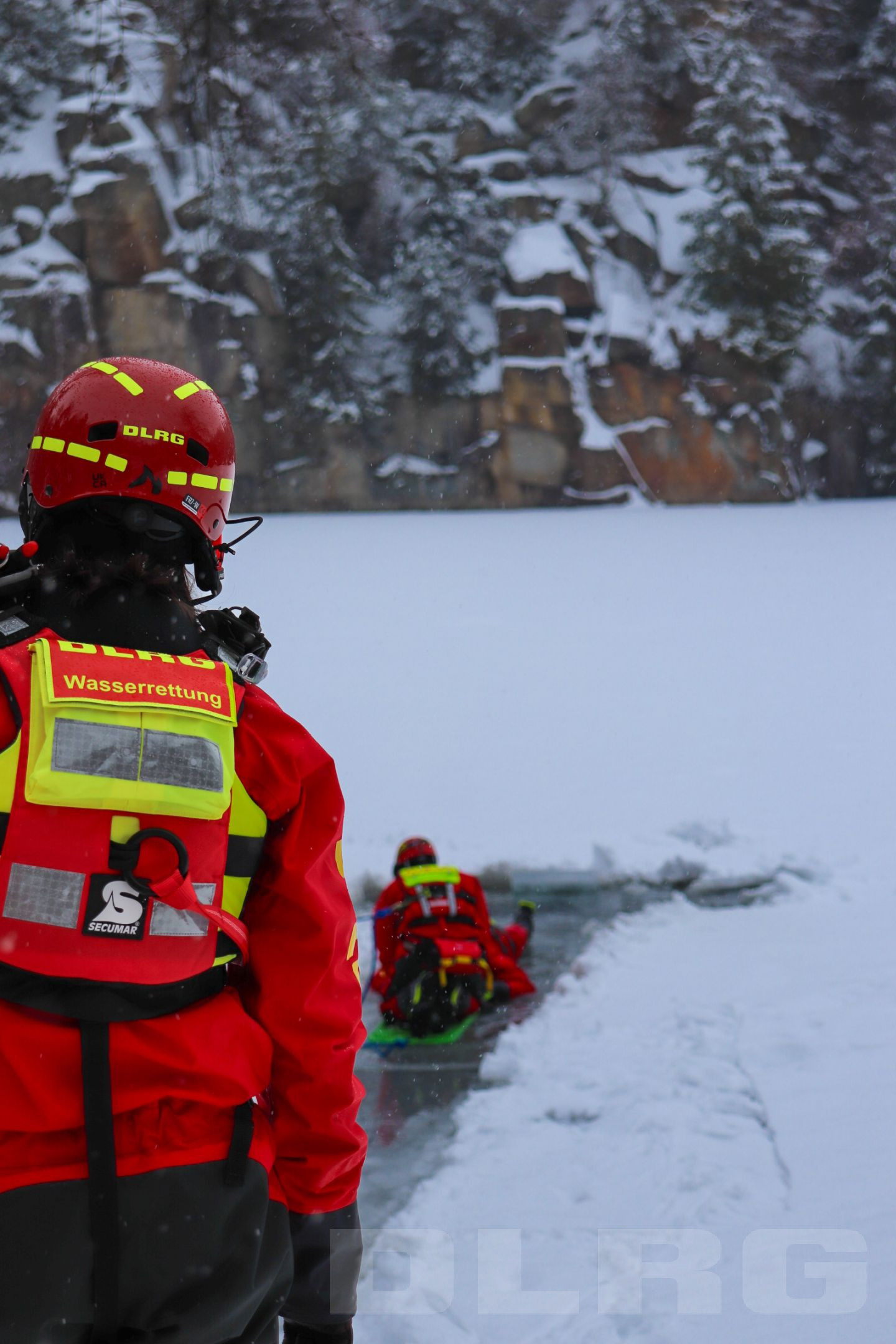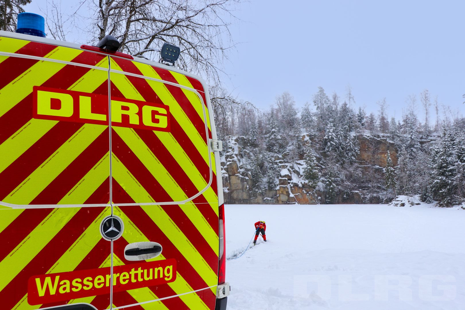 Büchlberg. Am Naturdenkmal Steinbruch regt sich am vergangenen Samstag etwas, mitten in der Winteridylle fährt ein großes Einsatzfahrzeug vor – die ortsansässige DLRG Wasserrettung. Die Ehrenamtlichen nutzen ihren Samstagnachmittag, um zu üben, Eisrettung steht heute auf dem Plan. Die Kälte der vergangenen Wochen hat den Steinbruchsee zufrieren lassen. „Die Eisdecke ist aber nicht überall gleich tragfähig“, weiß der Technische Leiter Michael Schneider. Es sei deshalb gefährlich einfach über den See zu spazieren.