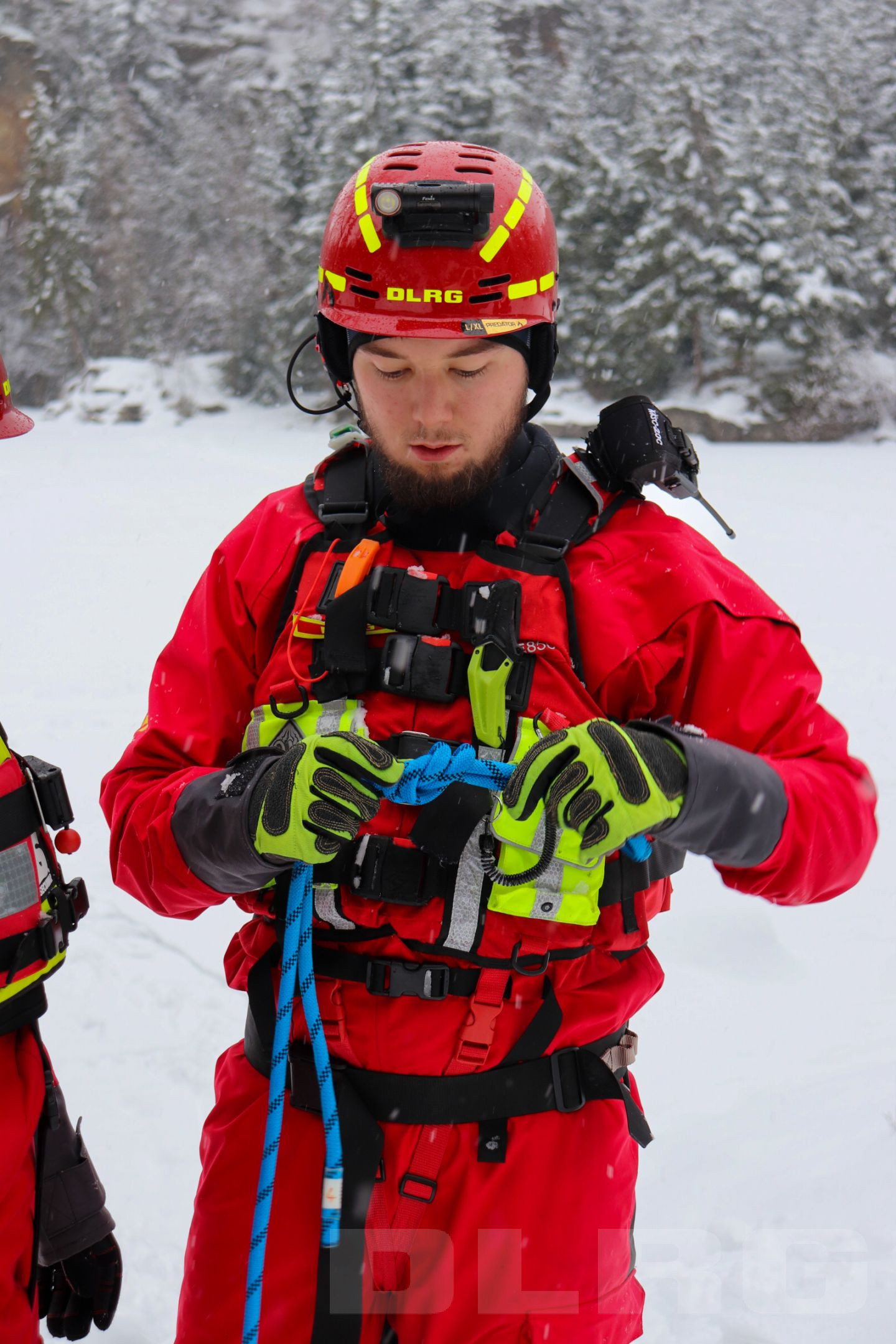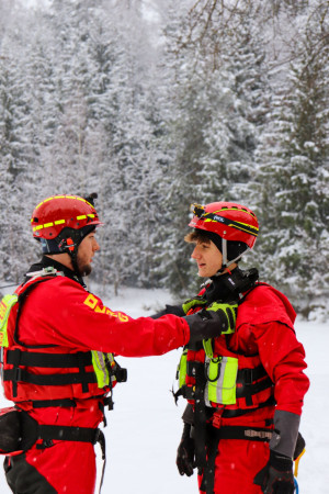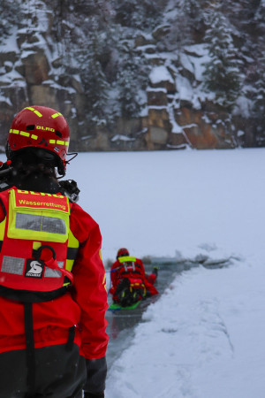 Als erster hüpft der Übungsleiter dann selbst in das kalte Wasser geschützt durch einen Trockenanzug, eine Weste mit Auftrieb und Handschuhe und wartet auf seine Rettung. Als einer der ersten probiert sich auch Patrick, er ist Teil des Jugend-Einsatz-Teams und heute bei der Übung dabei. Er und seine Teamkollegen trainieren regelmäßig mit den Einsatzkräften und werden so langsam an den Einsatzdienst herangeführt.