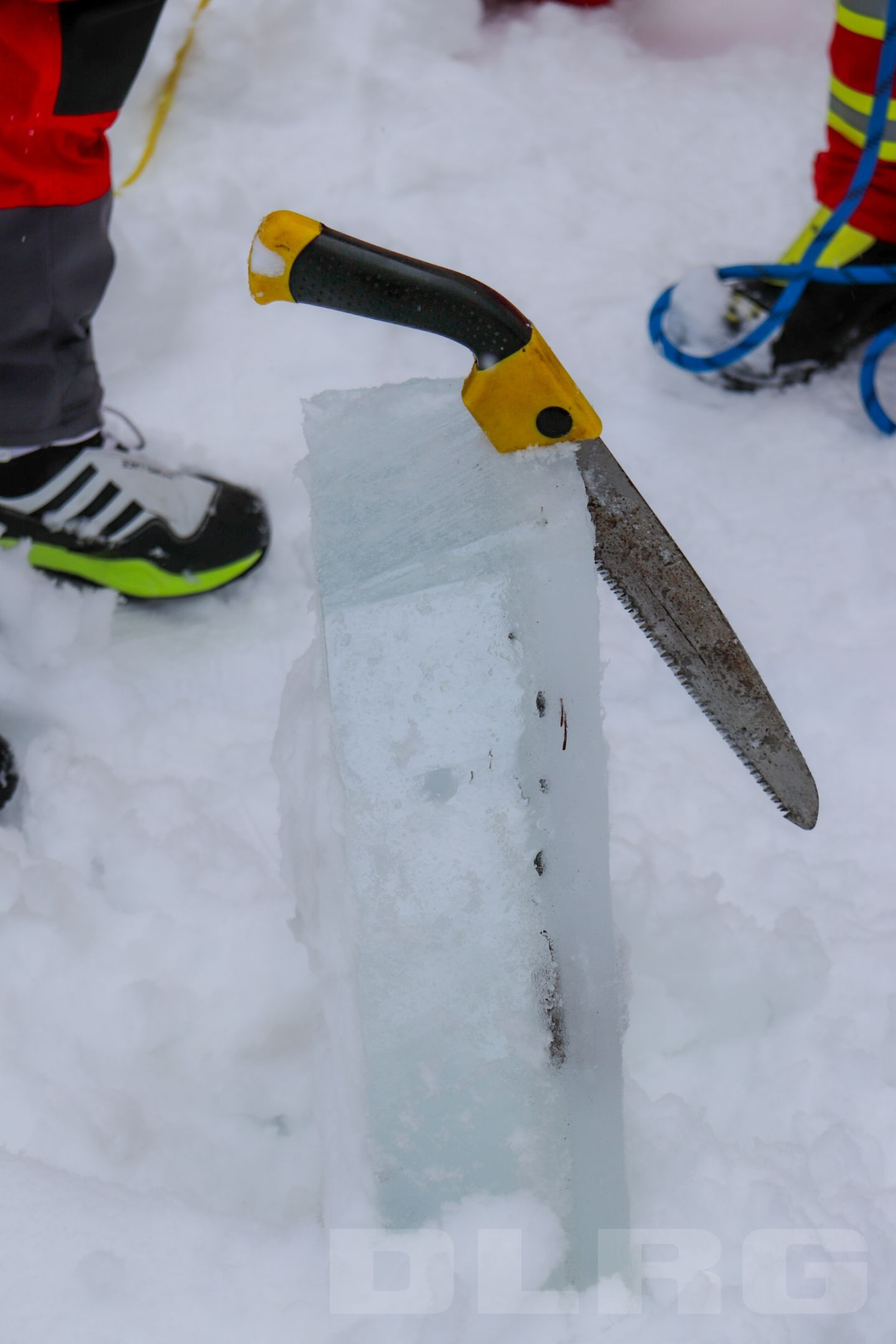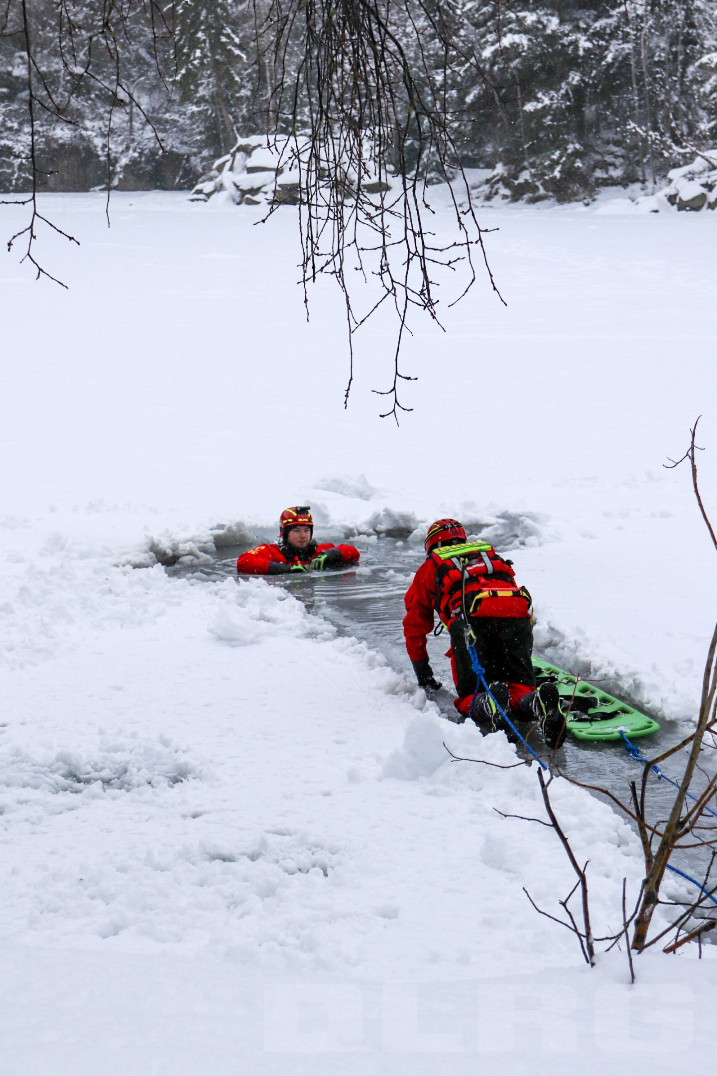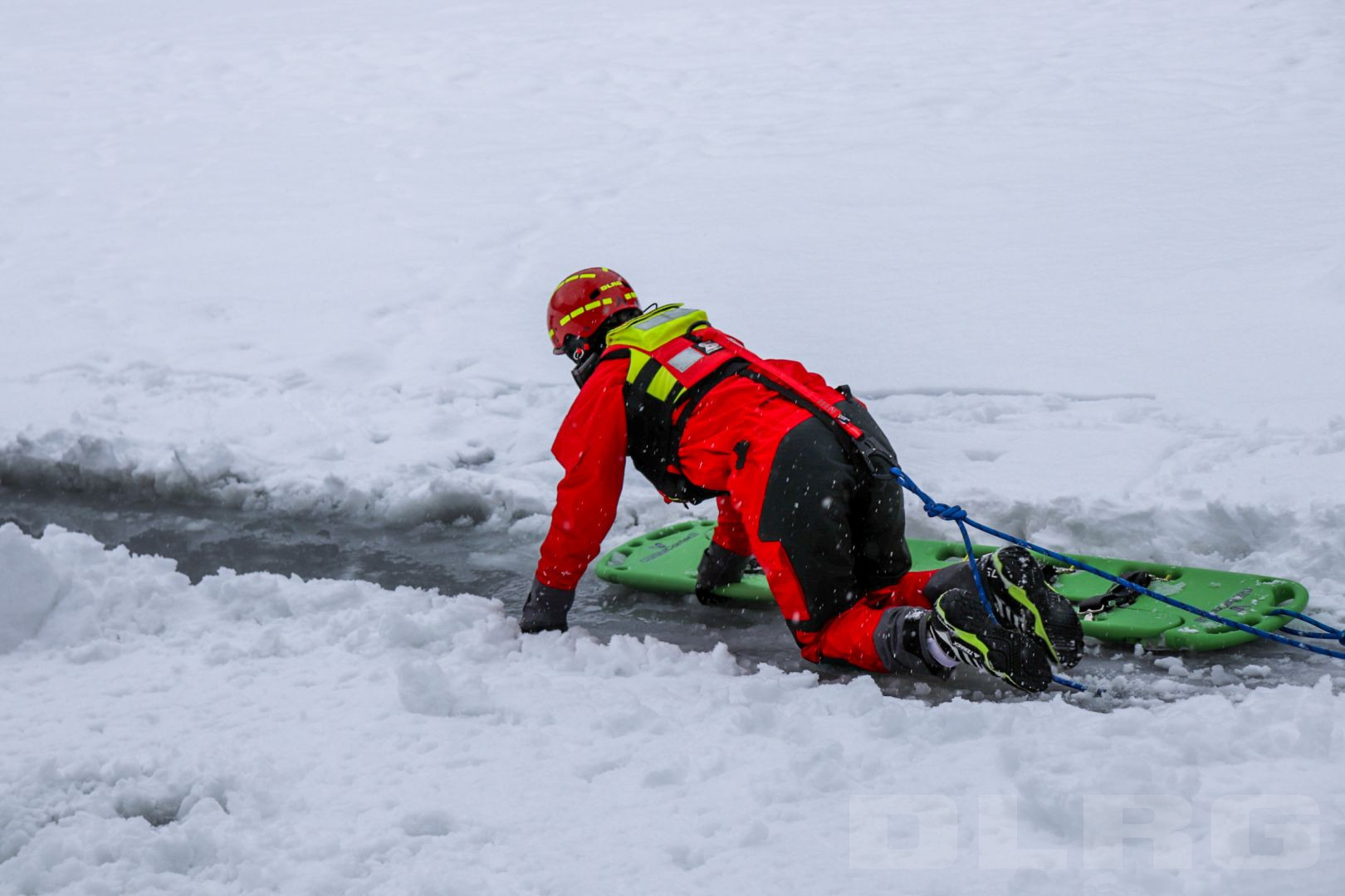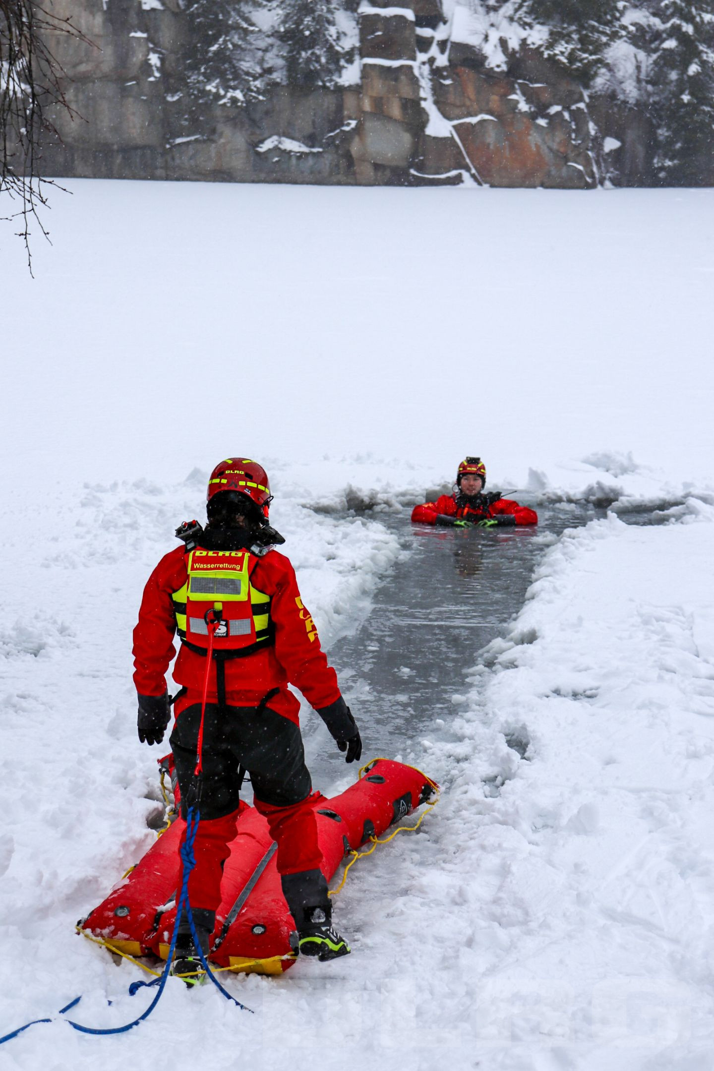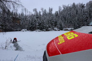 Nachdem eine Seilsicherung an einem Baum aufgebaut wurde, marschiert Übungsleiter Tobias Ramesberger mit einer Schneeschaufel auf den See hinaus, schiebt den Schnee zur Seite und schneidet ein Loch in die Eisdecke – knapp 15 cm hat das Eis an dieser Stelle. An Land wird währenddessen auch fleißig gewerkelt: Weitere Seilsicherungen aufbauen, Ausrüstung checken und schließlich wird auch der spezielle Eisrettungsschlitten mit Druckluft aufgeblasen. Das alles geschieht in eingespielter Teamarbeit.