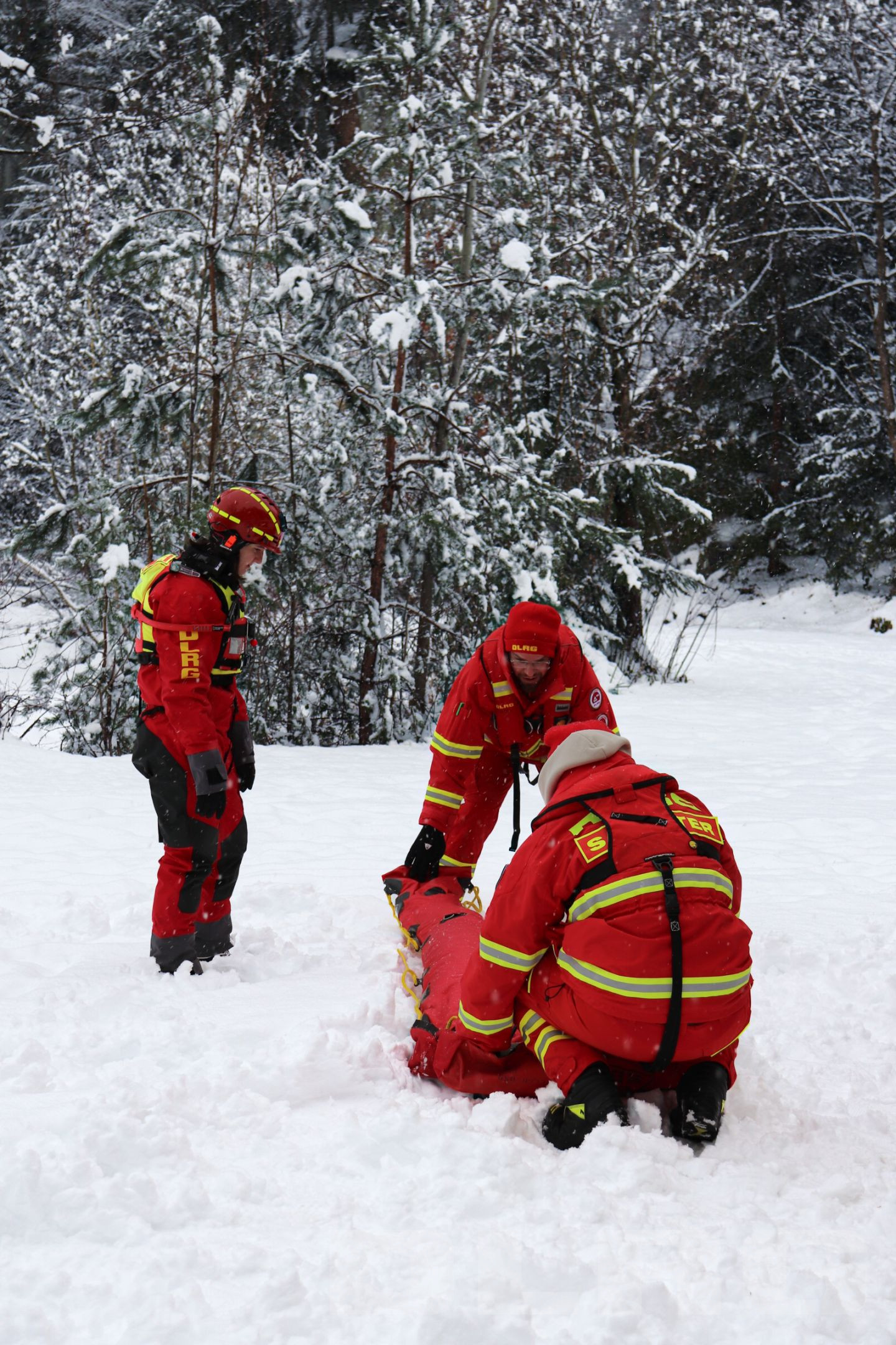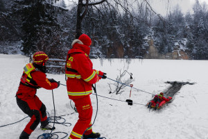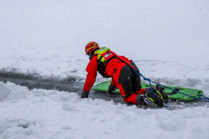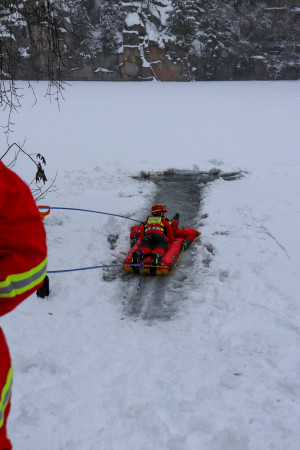 Vorne angekommen packt Patrick zu und zieht seinen Patienten auf den Eisrettungsschlitten. Sobald er ihn gesichert hat, gibt er ein Zeichen und die Kolleginnen und Kollegen ziehen die beiden an der Seilsicherung ans Ufer. Dann beginnt die Erstversorgung. „Bei stark unterkühlten Personen ist es wichtig sie nicht unnötig oder ruckartig zu bewegen“, betont Michael Schneider. Raus aus den nassen Klamotten warm einpacken und dann so schnell wie möglich in eine Klinik, sei hier die Devise.