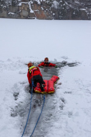 Zurück an Land erklärt Ramesberger das Vorgehen bei Eisunfällen. Die Einsatzkräfte müssen dabei zuallererst auf ihre eigene Sicherheit achten. „Das Beste ist, wenn ihr gar nicht aufs Eis müsst.“ Wenn es die Entfernung zulasse, soll man versuchen der Person einen Gegenstand wie z.B. eine langen Ast anzureichen. Ist die Einbruchstelle zu weit weg, so greift man zum sogenannten Wurfsack, der 18m Seil beinhaltet. An ihm kann sich die eingebrochene Person festhalten und damit an Land gezogen werden. Reicht auch das nicht so müssen die Retter selbst aufs Eis am besten mit einem Rettungsgerät wie dem Eisrettungsschlitten.